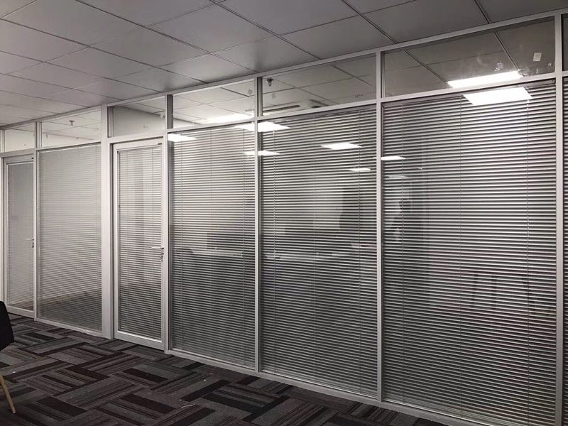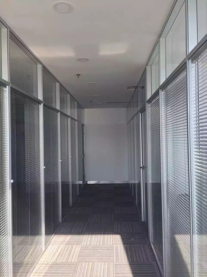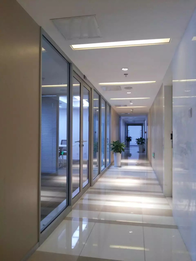 燕歸堂7080廣場項目:HX-85款單層8mm、雙層5mm鋼化玻璃隔斷,堅美氧化銀色隔斷型材,隔斷配套6mm鋼化玻璃有框玻璃門,12mm地彈簧玻璃門,兩棟寫字樓整體裝修,隔斷、玻璃門總面積4500平方。