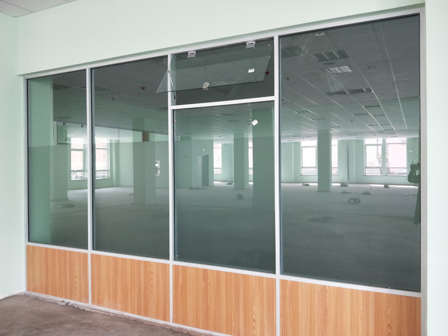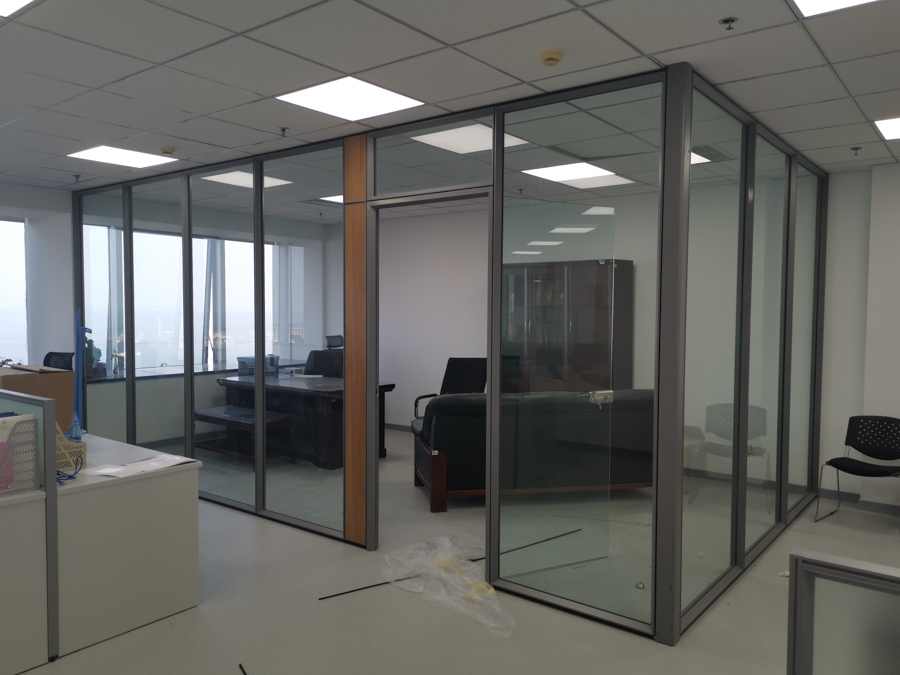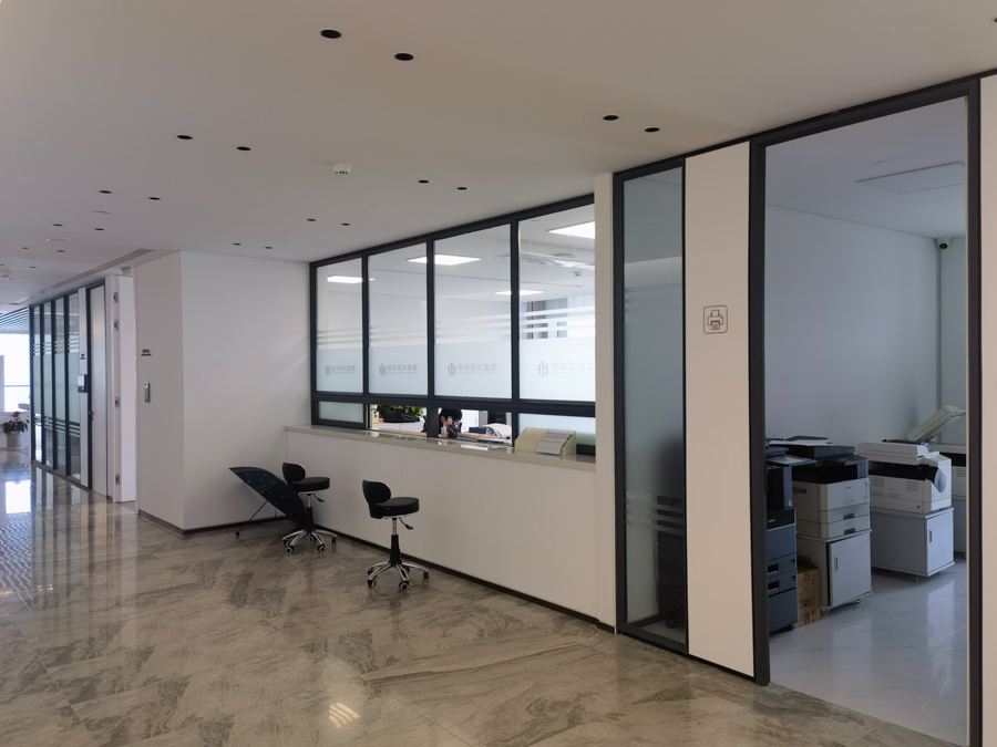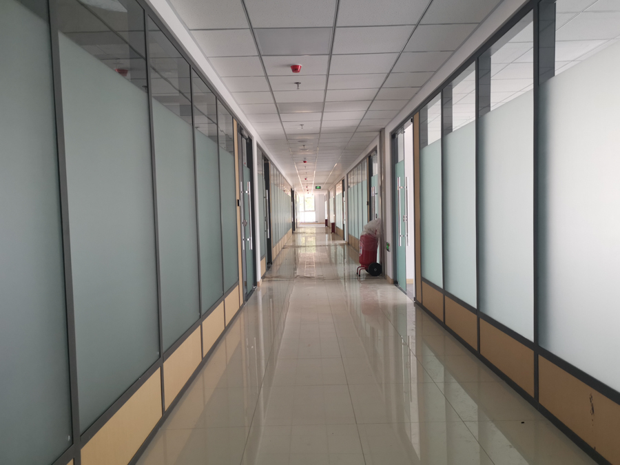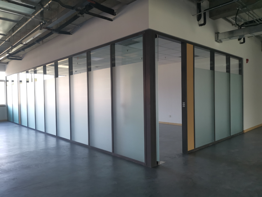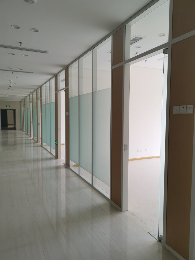 海信學(xué)校項目:HX-85款氧化銀色單層10mm鋼化玻璃及裝飾板復(fù)合隔斷,隔斷配套12mm鋼化玻璃門及門禁系統(tǒng)。