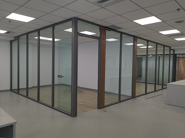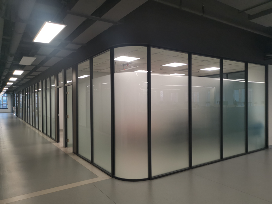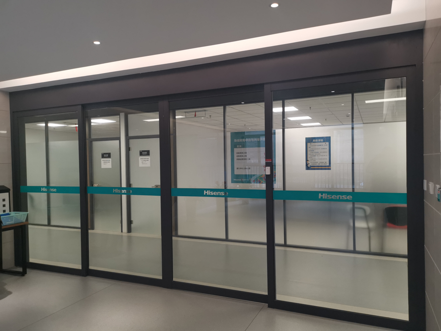 海信研發(fā)中心項目:HX-85款氧化銀色單層10mm鋼化玻璃及裝飾板復(fù)合隔斷,隔斷配套12mm鋼化玻璃門及門禁系統(tǒng)。