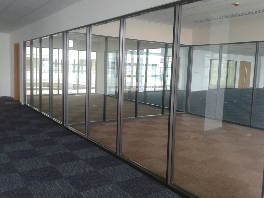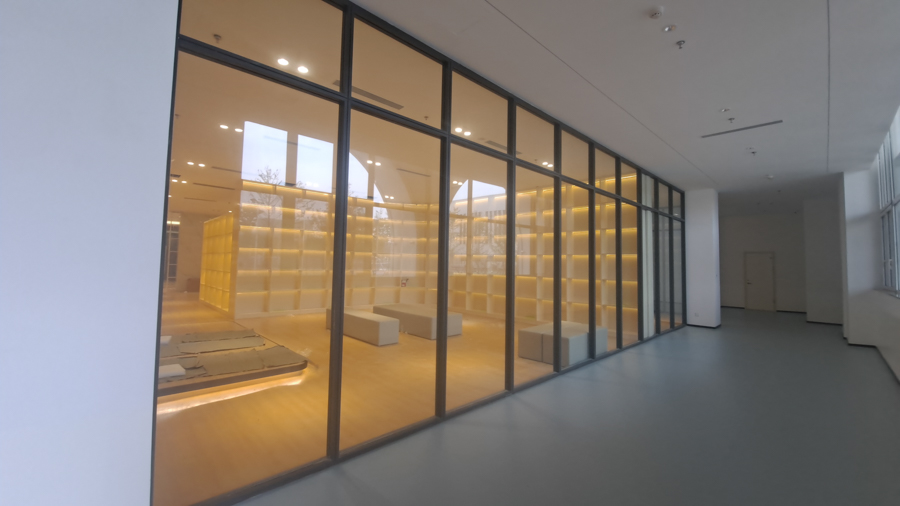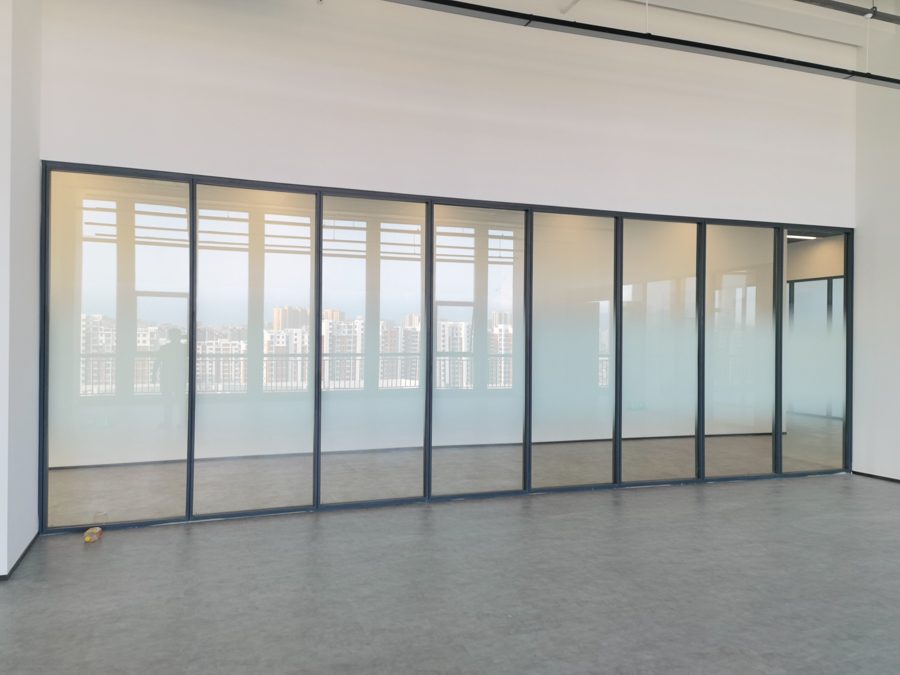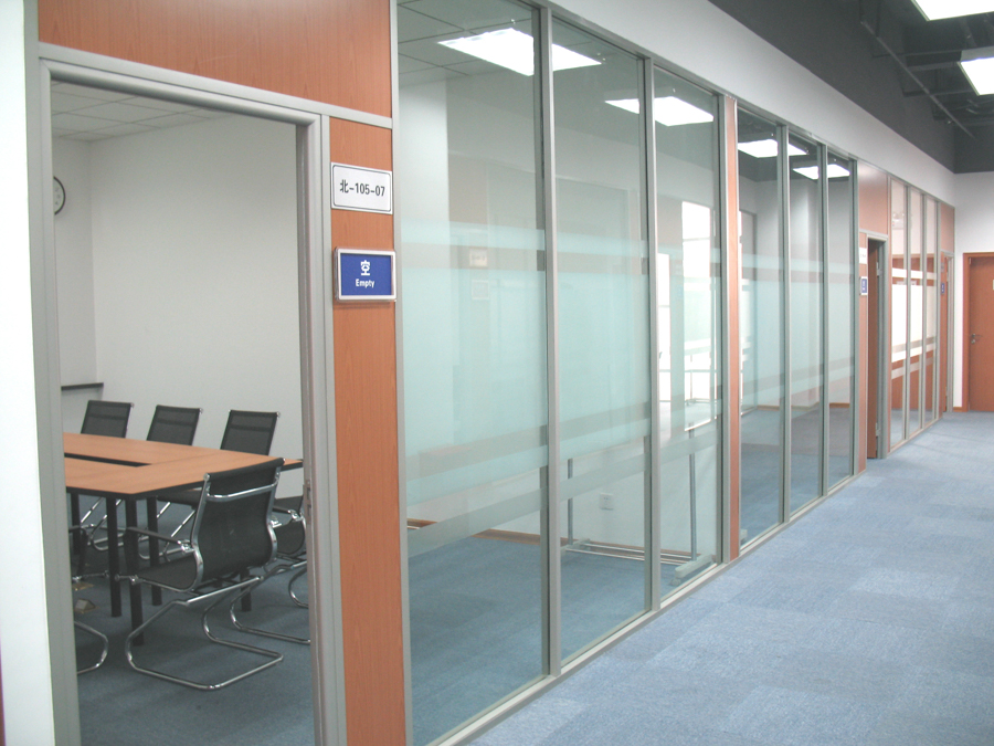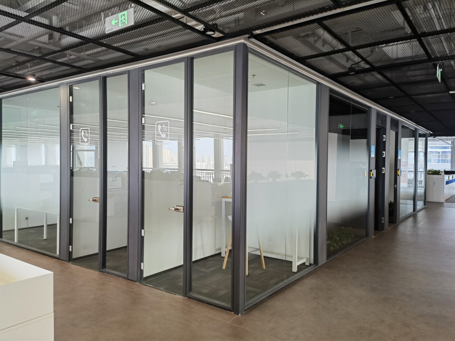 海爾全球中心項目:HX-85款氧化銀色單層10mm鋼化玻璃,隔斷配套10mm鋼化玻璃門扇。