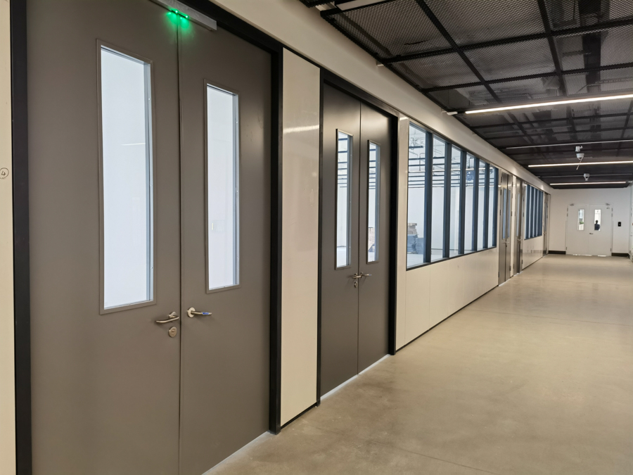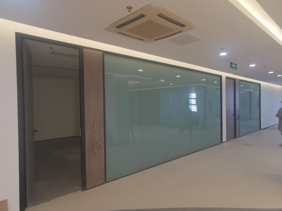 海爾創(chuàng)牌中心項目:HX-85款氧化銀色單層10mm鋼化玻璃,隔斷配套實木復合門。