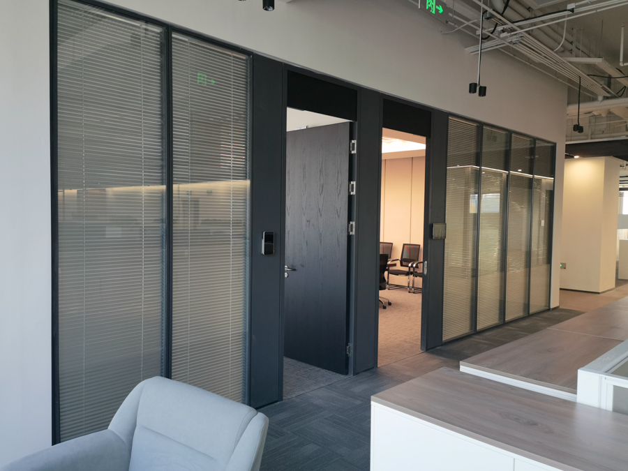 海爾空調(diào)水機項目:HX-85款氧化銀色,雙層5mm鋼化玻璃內(nèi)置百葉隔斷,隔斷配套12mm鋼化玻璃門扇。電梯廳自動門系統(tǒng)采用松下自動門及門禁系統(tǒng)。
